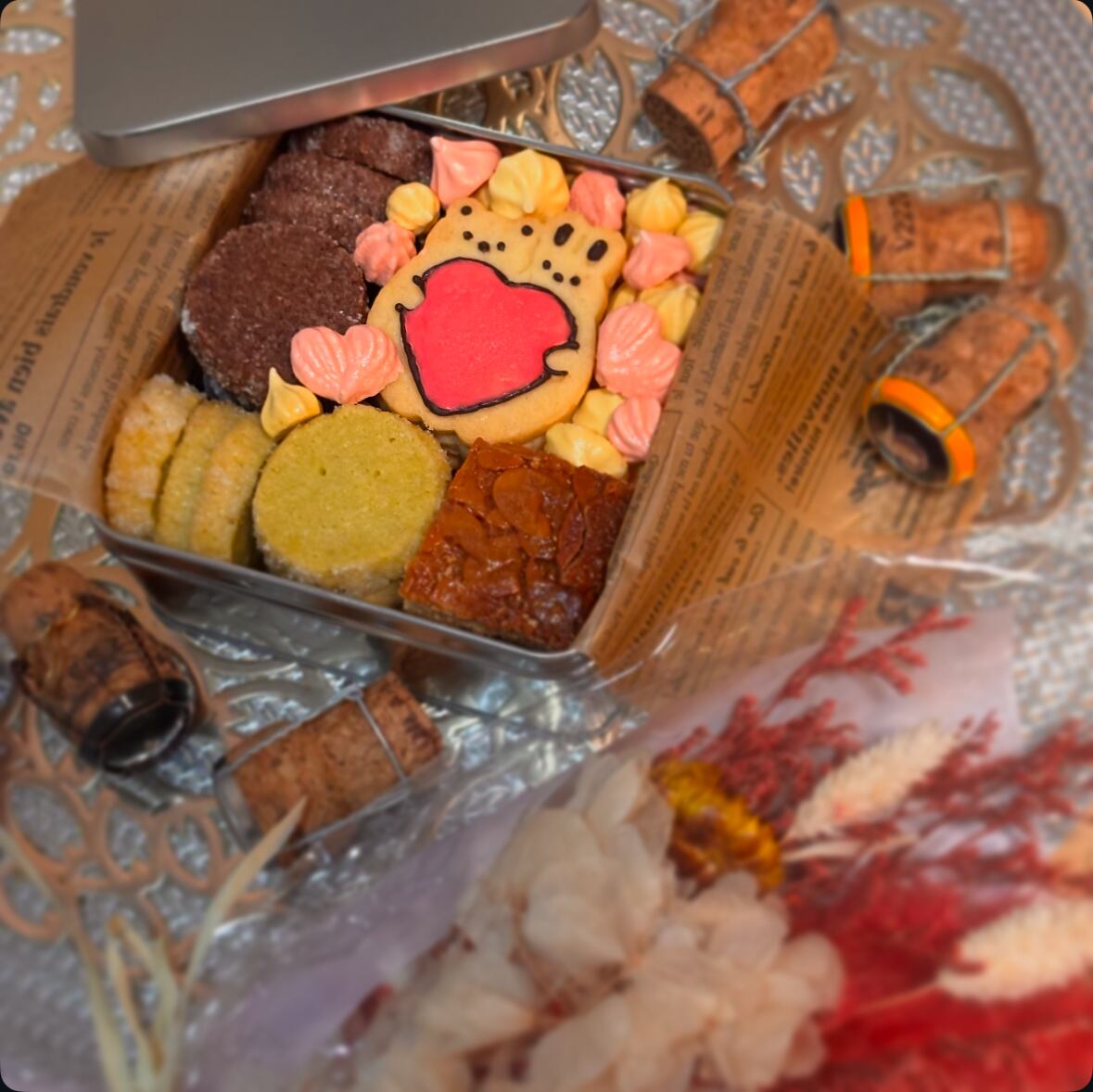 多彩なクッキーが詰まったこのクッキー缶は、プレーン、抹茶、チョコのディアマンクッキー、香ばしいフロランタン、軽やかなメレンゲクッキーなどがランダムに入っています。(※お好きなクッキーが入っていない場合もあります)ひと口ごとに広がる風味のハーモニーは、特別なひとときを彩ること間違いなしです。そして、くまさんとうさちゃんが持つハートの中には、お好きなメッセージを込めることができ、贈り物にもぴったりの一品です。このクッキー缶で、大切な方との心温まる時間をお過ごしください。